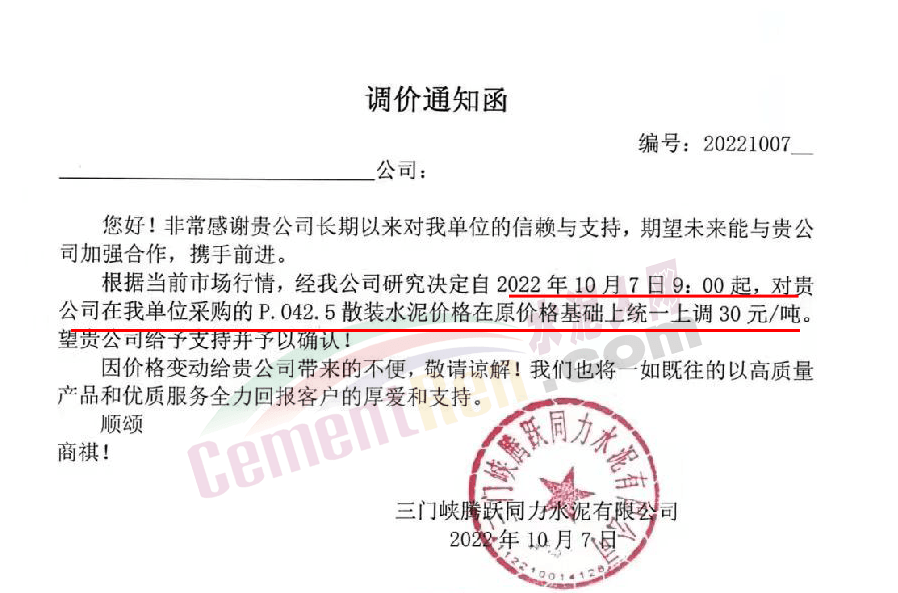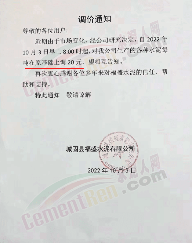 陜西省漢中市城固縣福盛水泥有限公司通知自10月3日早上8時起,對公司生產(chǎn)的各種水泥上調(diào)20元/噸。