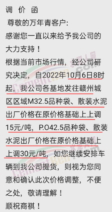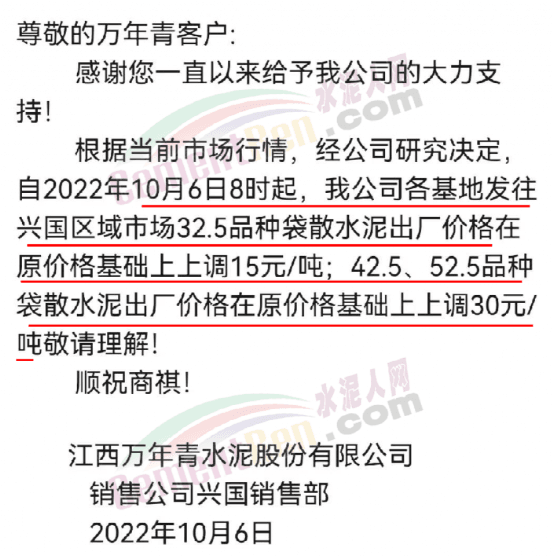 江西萬年青水泥股份有限公司通知,自10月6日8時起,公司各基地發(fā)往贛州城區(qū)以及興國區(qū)域32.5水泥出廠價上調(diào)15元/噸,42.5、52.5水泥出廠價上調(diào)30元/噸。