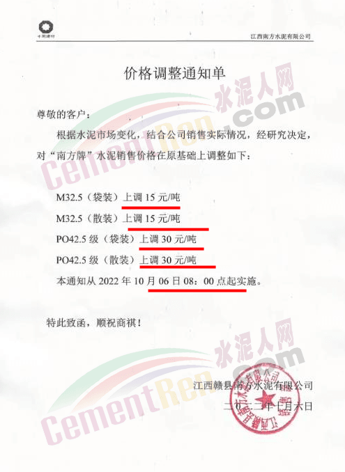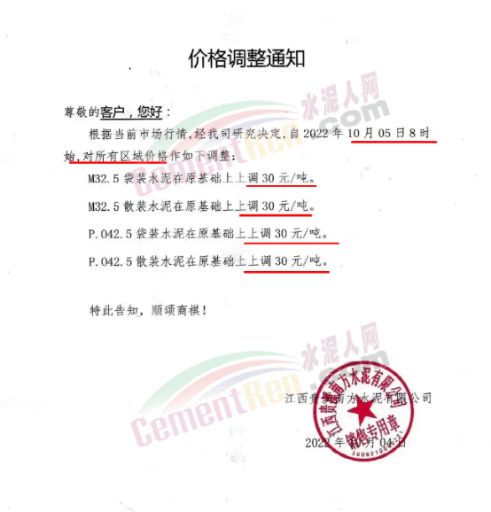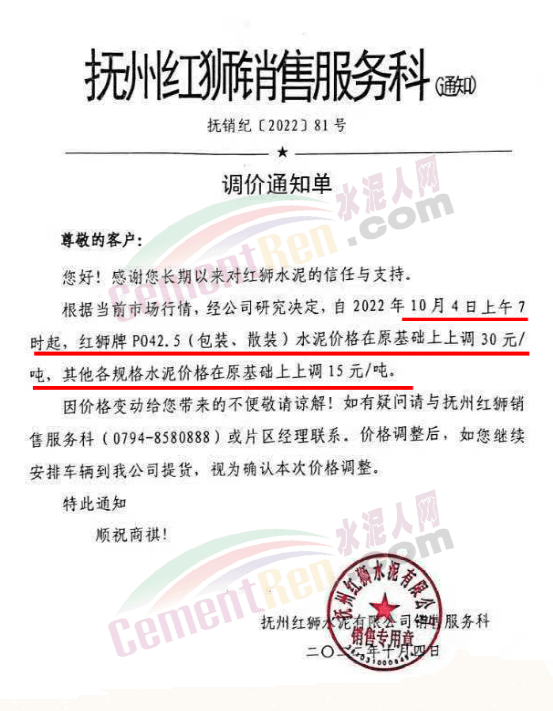 撫州紅獅水泥有限公司銷售服務科通知,自10月4日上午7時起,紅獅牌P.O42.5水泥價格上調(diào)30元/噸,其他規(guī)格水泥上調(diào)15元/噸。