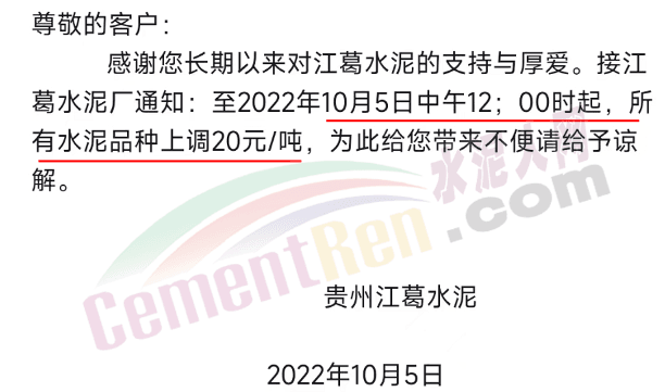 貴州江葛水泥通知,自10月5日中午12時起,所有水泥品種上調(diào)20元/噸。