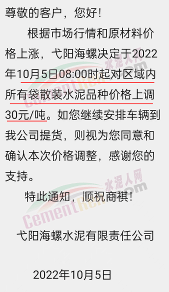 弋陽海螺水泥有限責任公司通知自10月5日8時起對區(qū)域內(nèi)所有水泥品種價格上調(diào)30元/噸。