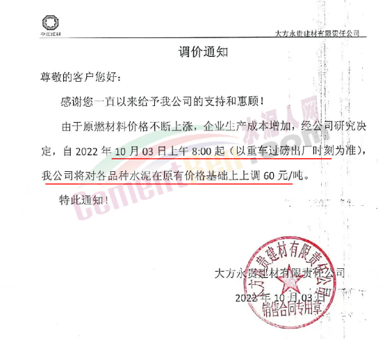 大方永貴建材有限公司通知,自10月3日上午8時起,各品種水泥在原價基礎上上調(diào)60元/噸。