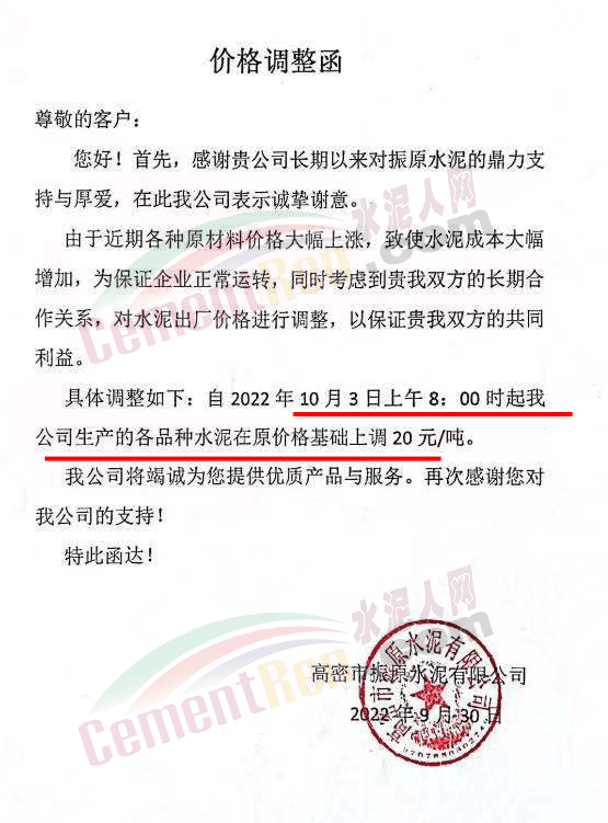 高密市振原水泥有限公司通知,由于近期各種原材料價格大幅上漲,致使水泥成本大幅增加,為保證企業(yè)正常運轉,自10月3日上午8時起,對水泥出廠價格上調(diào)20元/噸。