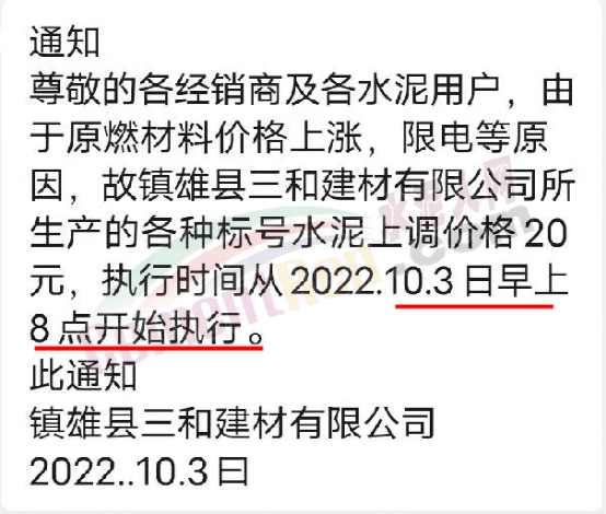 有水泥經(jīng)銷商通知:“8號-22號河南全省停窯,水泥原材料熟料上漲10元-30元,水泥三天內(nèi)還要漲價,需要囤水泥的趕緊聯(lián)系!”