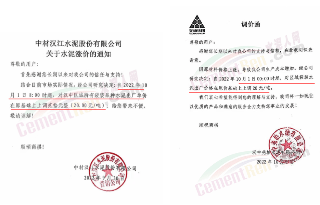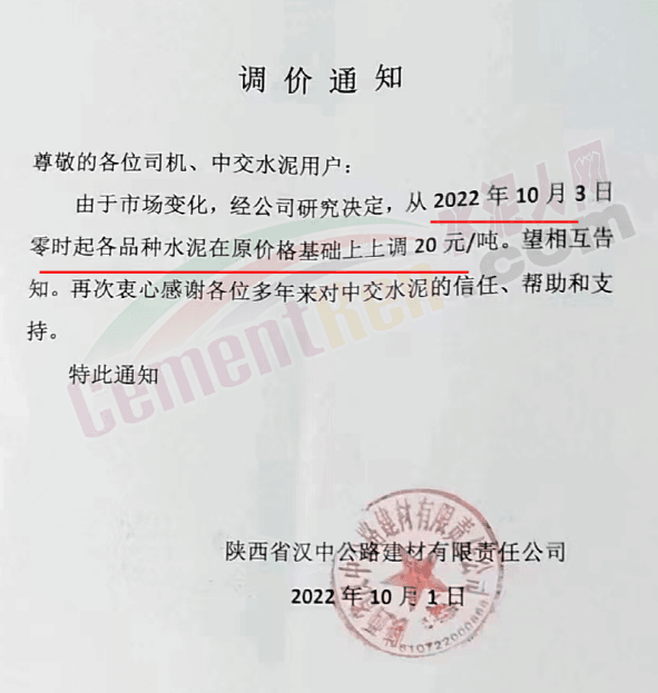 陜西省漢中公路建材有限責任公司通知10月3日零時起各品種水泥在原價基礎上上調(diào)20元/噸。