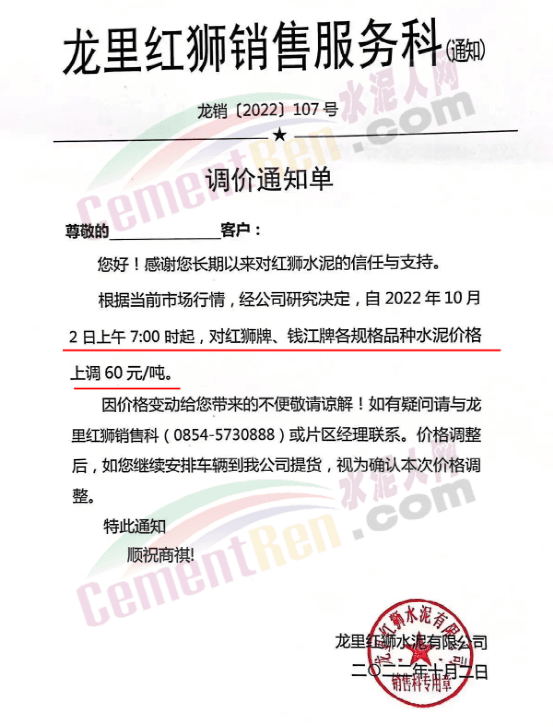 龍里紅獅水泥有限公司通知自10月2日上午7時起,對紅獅牌、錢江牌各規(guī)格品種水泥價格上調(diào)60元/噸。