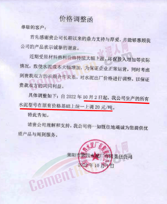 萊陽市第四水泥廠有限責任公司價格調(diào)整函稱,近期受原材料熟料價格持續(xù)大幅上漲,環(huán)保投入增加等實際情況,致使水泥成本大幅增加,為保證企業(yè)正常運營,自10月2日起對水泥出廠價格統(tǒng)一上調(diào)20元/噸。