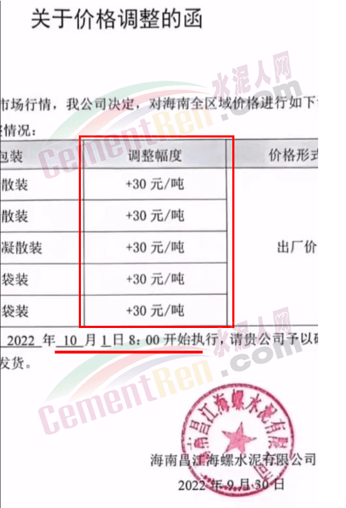 海南昌江海螺水泥有限公司通知自10月1日8時起各標號水泥出廠價上調(diào)30元/噸。