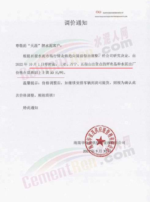 海南華亞茂供應鏈管理有限公司通知10月1日零時起,三亞、萬寧、五指山出貨點的所有品種水泥出廠價在原基礎上上調(diào)30元/噸。