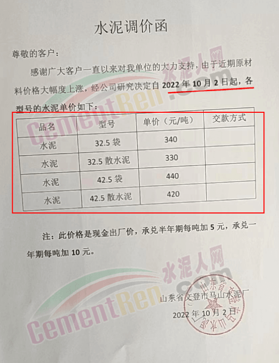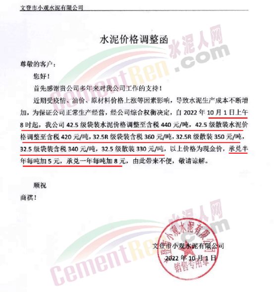 文登市小觀水泥有限公司價格調(diào)整函稱,近期受疫情、油價、原材料價格上漲等因素影響,導致水泥生產(chǎn)成本不斷增加,為保證公司正常生產(chǎn)經(jīng)營,經(jīng)公司綜合權衡決定,自2022年10月1日上午8時起,公司42.5級袋裝水泥價格調(diào)整至含稅440元/噸,42.5級散裝水泥價格調(diào)整至含稅420元/噸,32.5R級袋裝含稅360元/噸,32.5R級散裝350元/噸,32.5級袋裝含稅340元/噸,32.5級散裝330元/噸,以上價格為現(xiàn)金價,承兌半年每噸加5元,承兌一年每噸加8元。