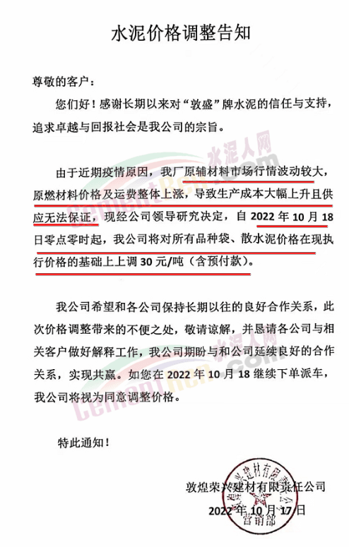 水泥人網(wǎng)通訊員消息:10月17日,甘肅酒泉敦煌榮興建材有限責(zé)任公司通知,由于近期疫情原因,工廠原輔材料市場行情波動較大,原燃材料價格及運(yùn)費(fèi)整體上漲,導(dǎo)致生產(chǎn)成本大幅上升且供應(yīng)無法保證,現(xiàn)經(jīng)公司領(lǐng)導(dǎo)研究決定,自2022年10月18日零點(diǎn)零時起,公司將對所有品種袋、散水泥價格在現(xiàn)執(zhí)行價格的基礎(chǔ)上上調(diào)30元/噸(含預(yù)付款)。