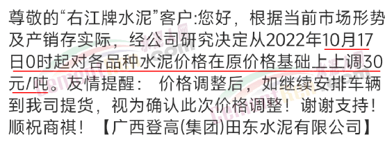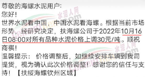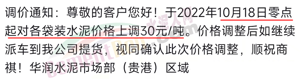 廣西華潤、海螺、南方、紅獅等多家企業(yè)通知上調(diào)水泥價格30元/噸