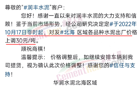華潤水泥北海區(qū)域通知10月17日零時起,對發(fā)北海區(qū)域各品種水泥出廠價格上調(diào)30元/噸。