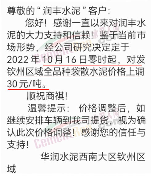 華潤水泥西南大區(qū)欽州區(qū)域通知,鑒于當(dāng)前市場形勢,經(jīng)公司研究決定于10月16日零時起,對發(fā)欽州區(qū)域全品種袋散水泥價格上調(diào)30元/噸。