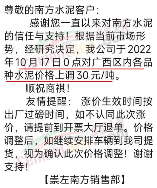 崇左南方銷售部通知,根據(jù)當(dāng)前市場形勢,經(jīng)研究決定公司于10月17日0點(diǎn)對廣西區(qū)域各品種水泥價格上調(diào)30元/噸。