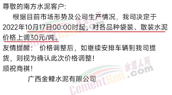 廣西金鯉水泥通知10月17日0時起,對各品種袋裝、散裝水泥價格上調(diào)30元/噸。