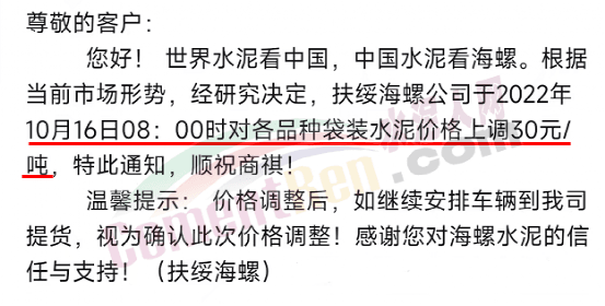 扶綏海螺欽州區(qū)域通知10月16日8時起,所有品種水泥價格上調(diào)30元/噸。