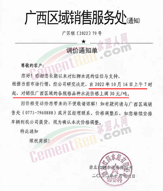崇左紅獅水泥有限公司廣西區(qū)域銷售服務(wù)處通知,自10月16日上午7時起,對銷往廣西區(qū)域的各規(guī)格品種水泥價格上調(diào)30元/噸。