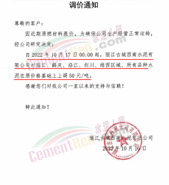 麗江古城西南水泥通知10月17日0時起,麗江古城西南水泥有限公司對麗江、鶴慶、沿江、劍川、維西區(qū)域所有品種水泥價格上調(diào)50元/噸。