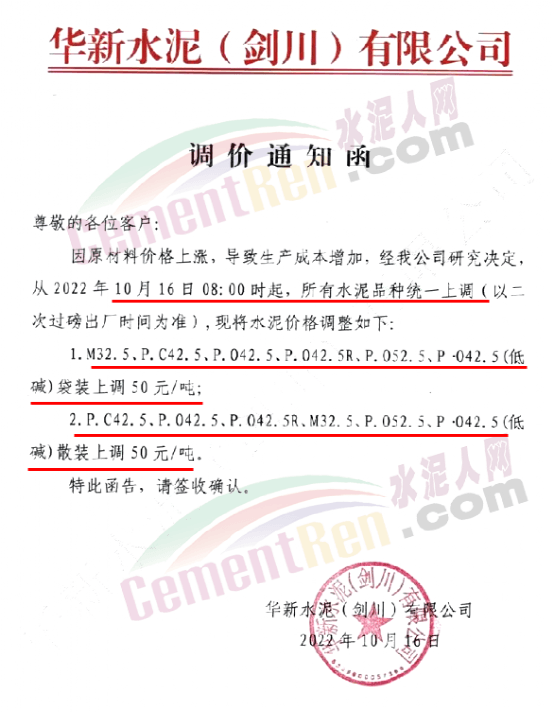 云南華新水泥(劍川)有限公司通知,10月16日8時起,所有水泥品種統(tǒng)一上調(diào)50元/噸。