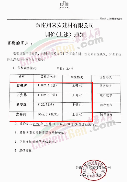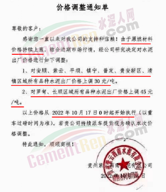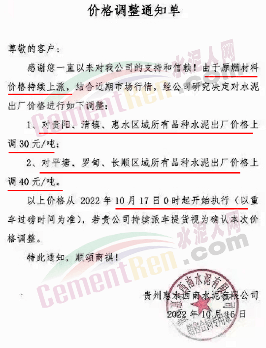 貴州惠水西南水泥通知,由于原燃材料價格持續(xù)上漲,自10月17日0時開始,對貴陽、清鎮(zhèn)、惠水區(qū)域水泥出廠價格上調(diào)30元/噸。對平塘、羅甸、長順區(qū)域所有品種水泥出廠價格上調(diào)40元/噸。
