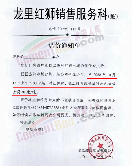 龍里紅獅水泥有限公司通知,10月17日上午7時起,對紅獅牌、錢江牌各規(guī)格品種水泥價格上調(diào)30元/噸。