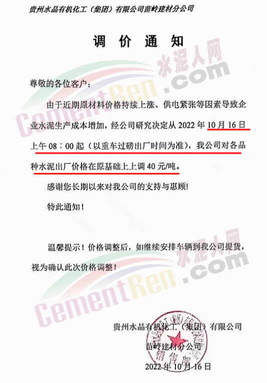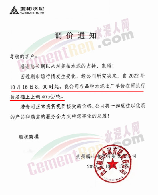貴州麟山水泥有限公司通知,自10月16日0時起,公司各品種水泥出廠單位在原執(zhí)行價格基礎(chǔ)上上調(diào)40元/噸。