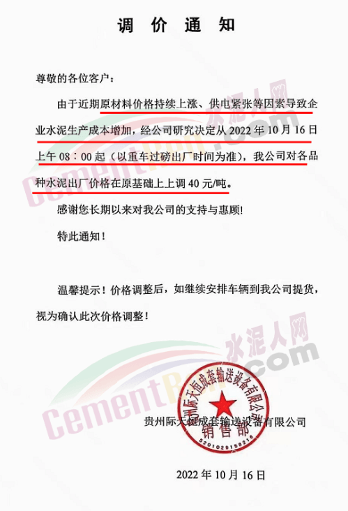 貴州際天恒成套輸送設(shè)備有限公司通知,由于近期原材料價格持續(xù)上漲、供電緊張等因素導(dǎo)致企業(yè)水泥生產(chǎn)成本增加。經(jīng)公司研究決定從10月16日上午8時起,對各品種水泥出廠價上調(diào)40元/噸。