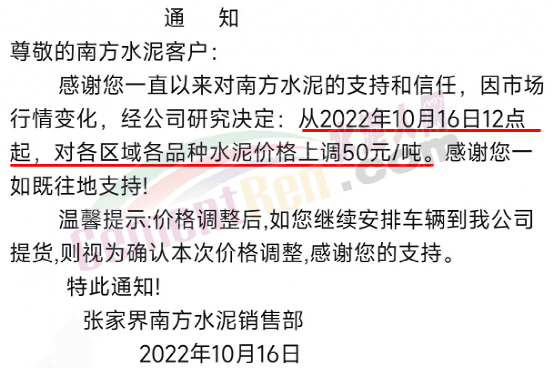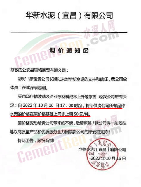 湖北華新水泥(宜昌)有限公司通知10月16日17時起,各標(biāo)號水泥上調(diào)50元/噸。