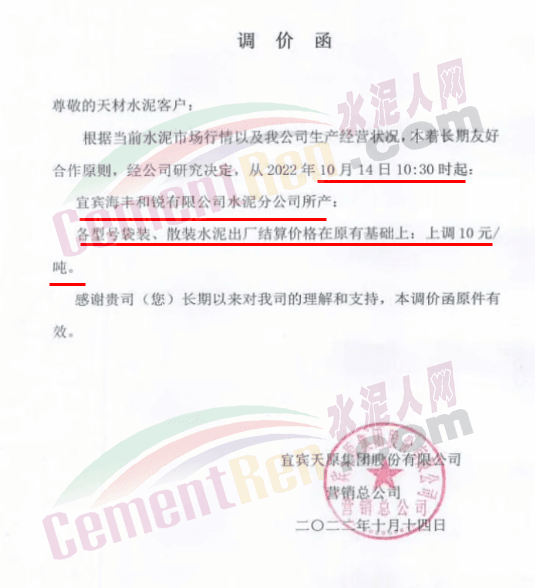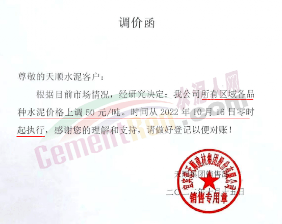 四川宜賓市天順建材集團(tuán)股份有限公司通知自10月16日零時起,所有區(qū)域各品種水泥價格上調(diào)50元/噸。