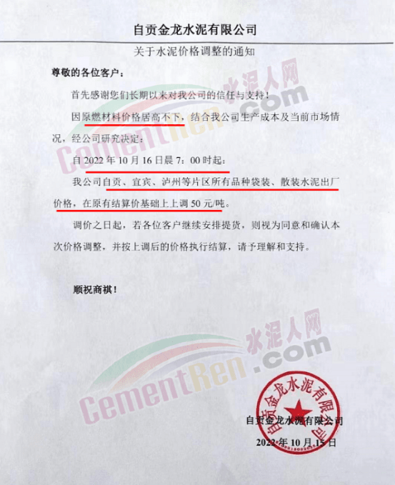自貢金龍水泥有限公司通知因原燃材料價格居高不下,結(jié)合公司生產(chǎn)成本及當(dāng)前市場情況,經(jīng)公司研究決定10月16日上午7時起,自貢、宜賓、瀘州片區(qū)所有品種袋裝、散裝水泥出廠價上調(diào)50元/噸。