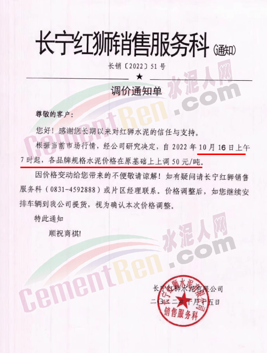 長寧紅獅銷售服務(wù)科通知,10月16日上午7時起,各品牌規(guī)格水泥價格在原基礎(chǔ)上上調(diào)50元/噸。