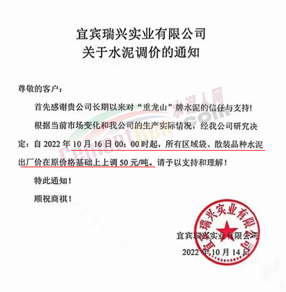 宜賓瑞興實(shí)業(yè)有限公司通知10月16日0時起,所有區(qū)域袋、散品種水泥上調(diào)50元/噸。