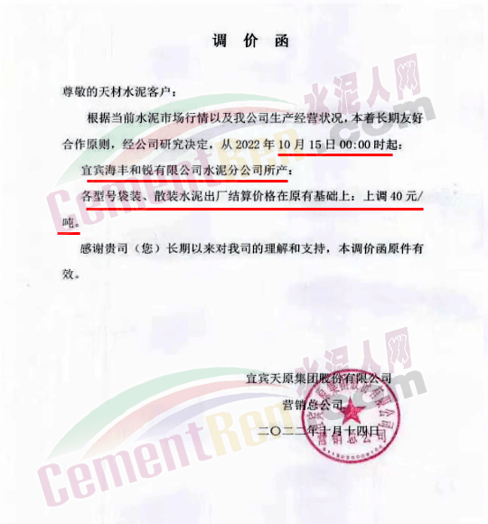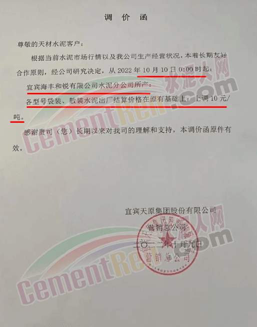 宜賓天原集團(tuán)股份有限公司營銷總公司分別于10月10日、14日、15日連續(xù)上調(diào)水泥價格10元/噸、10元/噸、40元/噸,三次累計上調(diào)60元/噸。