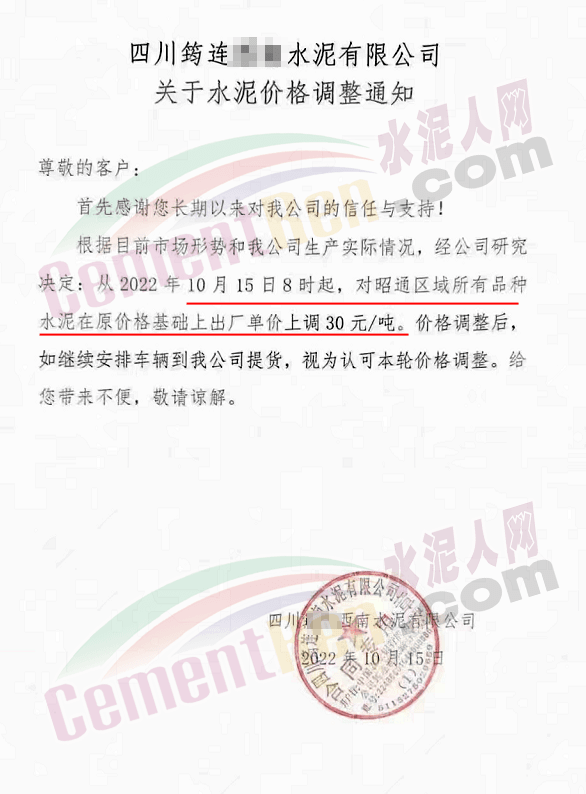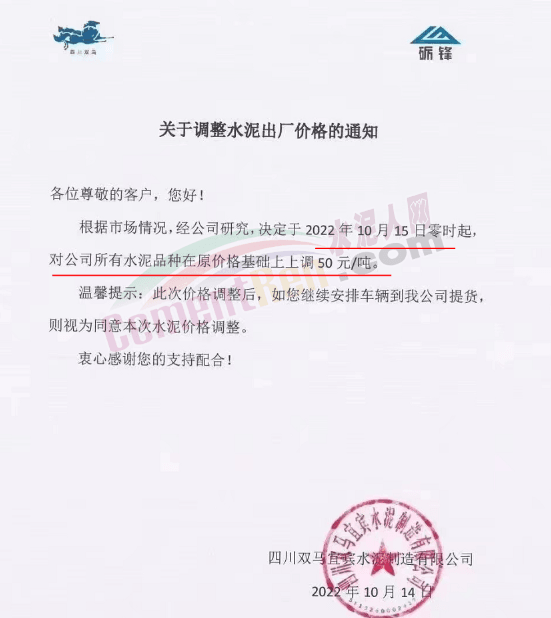 四川雙馬宜水泥制造有限公司通知10月15日零時起對公司所有水泥品種上調(diào)50元/噸。