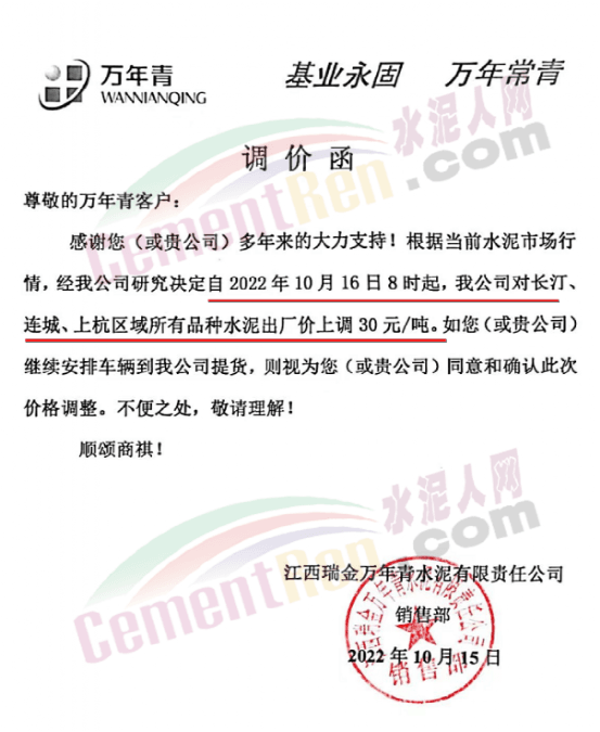 江西瑞金萬年青水泥有限責(zé)任公司通知10月16日8時起,公司對長汀、連城、上杭區(qū)域所有品種水泥出廠價上調(diào)30元/噸。