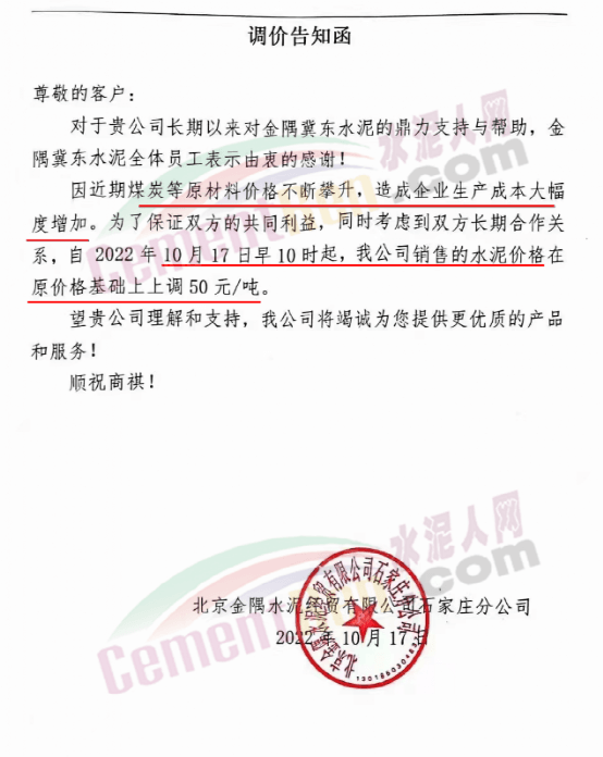北京金隅水泥經(jīng)貿(mào)有限公司石家莊分公司通知,因近期煤炭等原材料價格不斷攀升,造成企業(yè)生產(chǎn)成本一大幅度增加。自10月17日早10時起,公司銷售的水泥價格在原基礎(chǔ)上上調(diào)50元/噸。