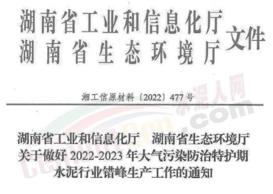 湖南省發(fā)布《關(guān)于做好2022-2023年大氣污染防治特護(hù)期水泥行業(yè)錯峰生產(chǎn)工作的通知》要求 2022-2023年大氣污染防治特護(hù)期間,長株潭及傳輸通道城市(岳陽市、常德市、益陽市)水泥熟料生產(chǎn)線錯峰生產(chǎn)天數(shù)基數(shù)為80天,其他市州為75天,其中2022年第四季度(10月16日-12月31日)錯峰生產(chǎn)時間不少于30天。