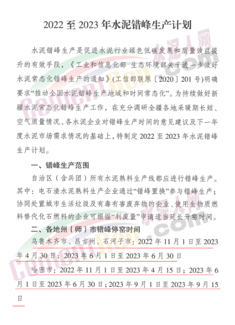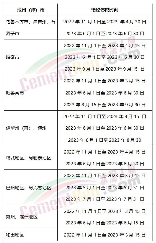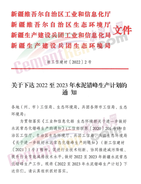 新疆維吾爾自治區(qū)發(fā)《關(guān)于下達(dá)2022至2023年水泥錯峰生產(chǎn)計劃的通知》稱,為持續(xù)做好新疆水泥常態(tài)化錯峰生產(chǎn)工作,在充分調(diào)研全疆各地采暖期長短、空氣質(zhì)量情況、各水泥企業(yè)對錯峰生產(chǎn)時間的意見建議及下一年度水泥市場需求情況的基礎(chǔ)上,特制定2022至2023年水泥錯峰生產(chǎn)計劃。