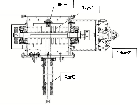 1500~2000mm,負(fù)責(zé)處理平板閘以上結(jié)拱的塊狀料甚至大塊料,中空油缸聯(lián)接羅茨風(fēng)機(jī)到減壓錐內(nèi)部可以替代部分充氣箱功能,以解決架空料的處理難題;下部在破碎機(jī)構(gòu),將溜下到破碎腔的塊狀料破碎成 2 公分左右的小塊,使得小塊能隨粉料一起被斜槽送走,解決在斜槽卸料器拐彎處堵料問題;由于本身破碎腔中自帶約 2.5 公分間隙,對(duì)正常粉料卸料沒有影響。如果發(fā)生破碎腔有堵,反而說明里面有塊狀料,這時(shí)只要開啟疏堵機(jī),就能快速疏通。由于現(xiàn)場(chǎng)安裝空間所限和提供較強(qiáng)的破碎能力,該系統(tǒng)采用了液壓馬達(dá),羅茨風(fēng)機(jī),與液壓捅料機(jī)構(gòu)合起來集成為一個(gè)液壓系統(tǒng)。其設(shè)備示意圖如下:
