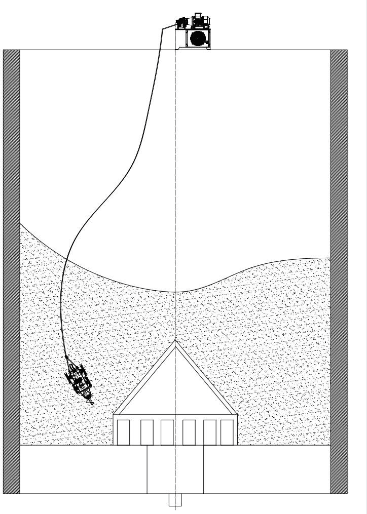 將機(jī)器人從堵料的水泥庫(kù)頂部用牽引繩放入庫(kù)內(nèi),到達(dá)料面以后,啟動(dòng)系統(tǒng), 機(jī)器人根據(jù)庫(kù)外遠(yuǎn)程遙控操作系統(tǒng)和內(nèi)置陀螺儀到達(dá)堵料的位置,即可啟動(dòng)掘進(jìn)驅(qū)動(dòng)馬達(dá)和行走送料馬達(dá),掘進(jìn)頭在掘轉(zhuǎn)過程中,將凝結(jié)成塊的水泥切割松散; 需要調(diào)整機(jī)器人前進(jìn)方向時(shí),可以通過控制兩組后驅(qū)動(dòng)馬達(dá),即可調(diào)整到方向。機(jī)箱尾部有防翻轉(zhuǎn)尾舵,可以保證機(jī)器人穩(wěn)定的作業(yè)姿態(tài),并且尾舵不影響機(jī)器人的前進(jìn)和后退作業(yè)。