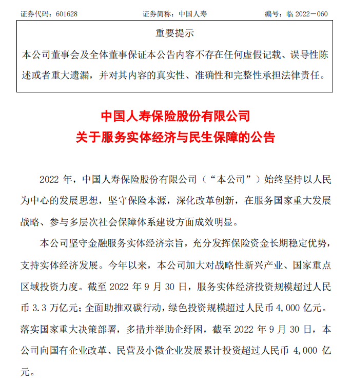 除國(guó)有大行外,中國(guó)人壽保險(xiǎn)16日也發(fā)布公告稱(chēng),充分發(fā)揮保險(xiǎn)資金長(zhǎng)期穩(wěn)定優(yōu)勢(shì),支持實(shí)體經(jīng)濟(jì)發(fā)展。截至9月末,該公司服務(wù)實(shí)體經(jīng)濟(jì)投資規(guī)模超過(guò)人民幣3.3萬(wàn)億元;在全國(guó)承辦200多個(gè)大病保險(xiǎn)項(xiàng)目,覆蓋近3.5億人。