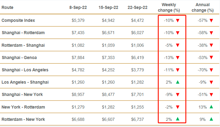 德路里的世界集裝箱運價指數(shù)(WCI)已連續(xù)30周下降,較去年同期下跌57%。上海-熱那亞的運費下跌13%至6419美元/FEU;上海-洛杉磯的運費下跌11%至3779美元/FEU;上海-鹿特丹和上海-紐約的運費分別下降10%和9%至6027美元/FEU和7701美元/FEU。