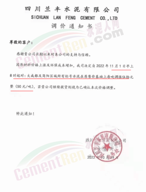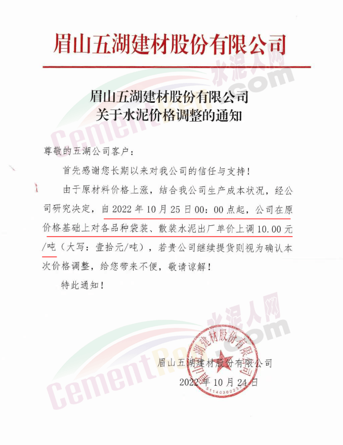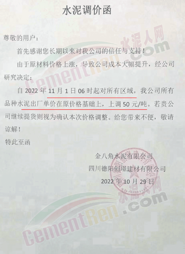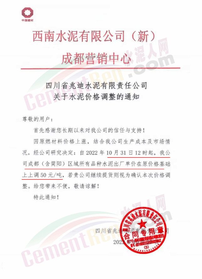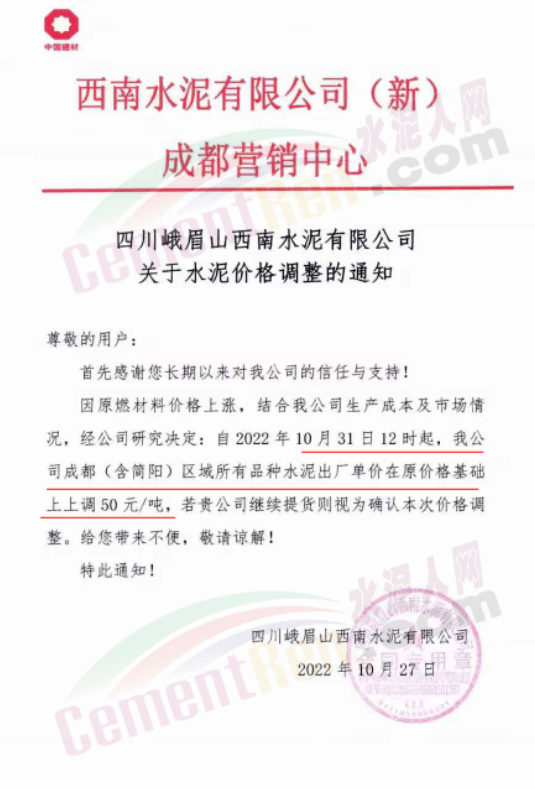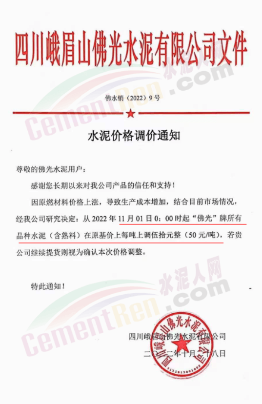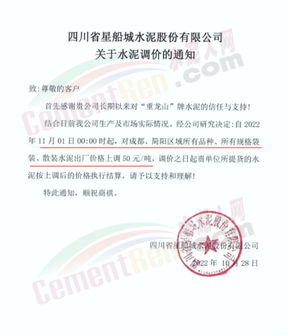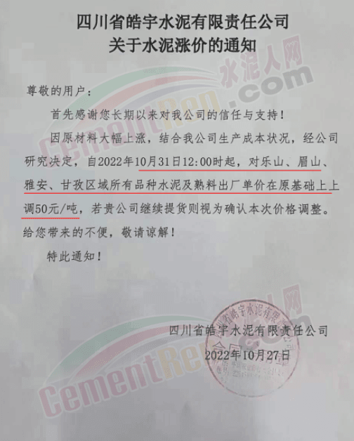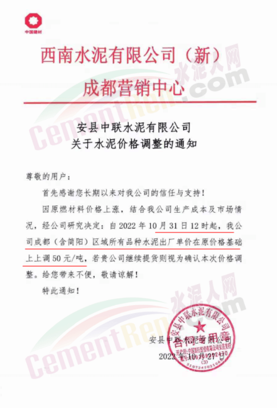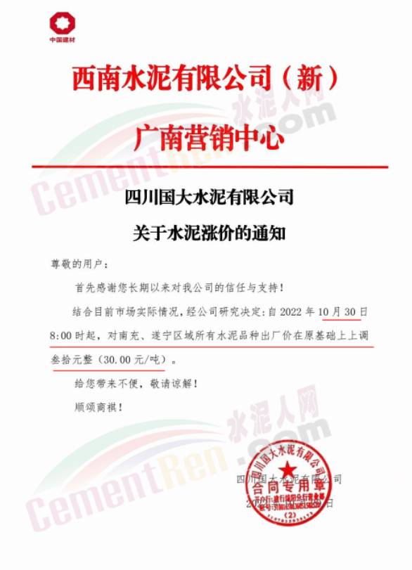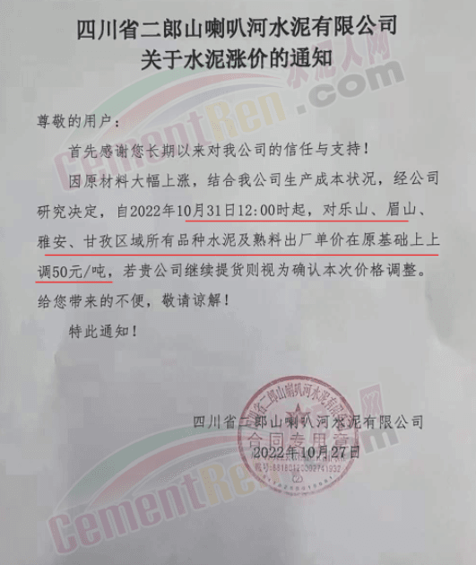 據(jù)了解,本輪調(diào)價是從10月30日起,包括粉磨站在內(nèi)的多家水泥企業(yè)通知上調(diào)水泥價格50元/噸,熟料價格同步上調(diào)30元/噸。