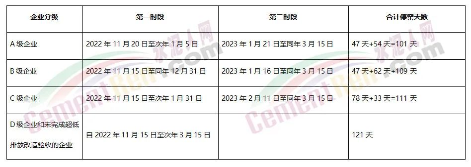 采暖期通用水泥熟料生產(chǎn)線錯峰生產(chǎn)時間按照企業(yè)環(huán)??冃У燃壴u定結(jié)果分別安排,停產(chǎn)時間從63天~121天不等。其中A級企業(yè)定于2022年11月20日至次年1月5日和2023年1月21日至同年3月15日兩個時段分別停窯47天和54天,采暖期停窯101天;D級企業(yè)和未完成超低排放改造驗收的企業(yè),自2022年11月15日至次年3月15日,采暖期共停121天。
