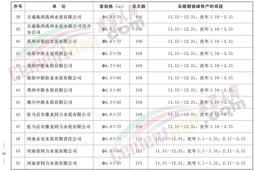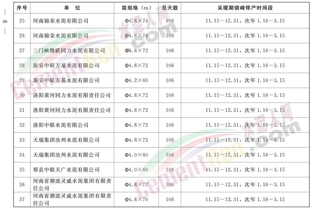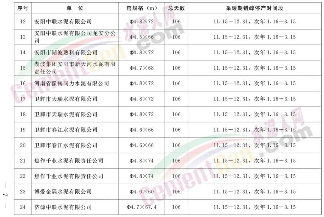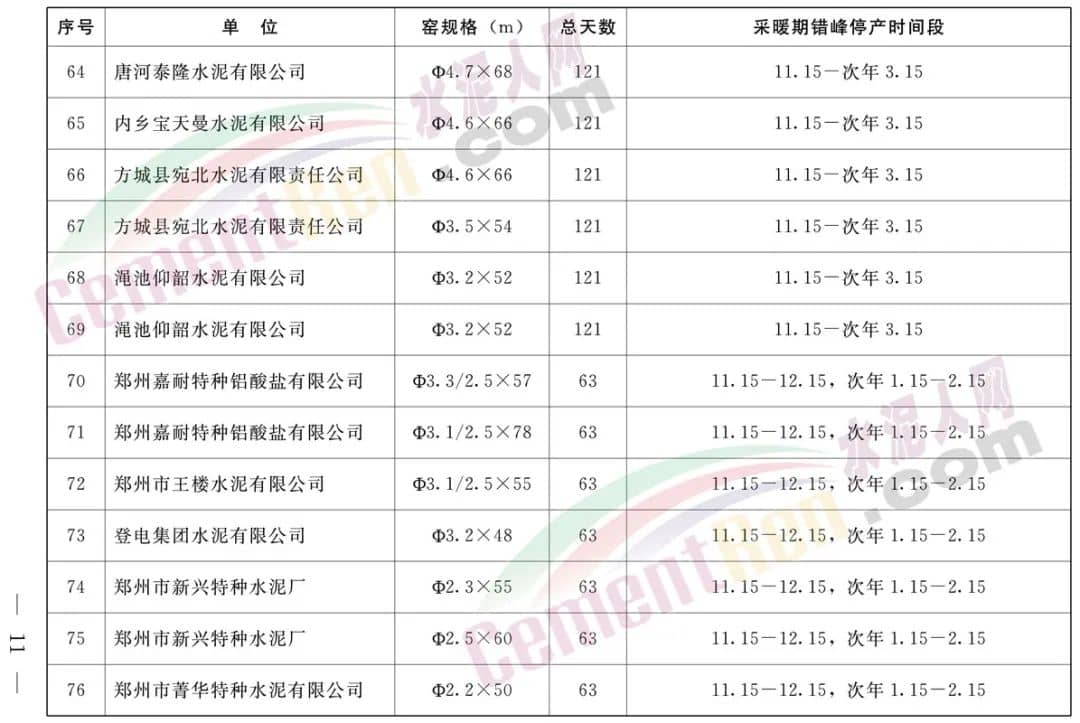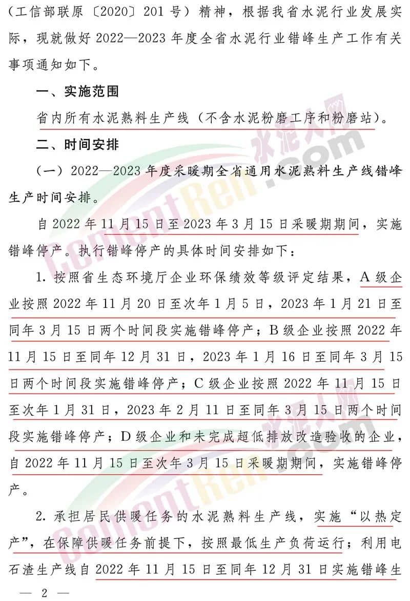采暖期全省鋁酸鹽、硫鋁酸鹽、白色硅酸鹽水泥熟料生產(chǎn)線錯峰生產(chǎn)時間安排,自2022年11月15日至同年12月15日(31天),2023年1月15日至同年2月15日(32天)期間,按照上述兩個時間段實施錯峰停產(chǎn)。