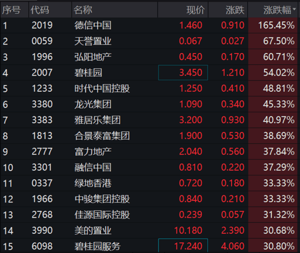 11月14日,內(nèi)地房地產(chǎn)指數(shù)漲超10%。德信中國(guó)漲超165%,天譽(yù)置業(yè)、弘陽(yáng)地產(chǎn)漲超60%,碧桂園漲54%,時(shí)代中國(guó)控股、龍光集團(tuán)、雅居樂集團(tuán)漲超40%,富力地產(chǎn)、融信中國(guó)漲超35%,美的置業(yè)新城控股、龍湖集團(tuán)漲超20%。