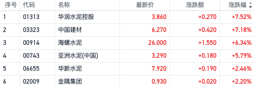水泥股早盤普漲,截止下午14時(shí),華潤(rùn)水泥控股,中國(guó)建材漲超7%、海螺水泥漲超6%,華新水泥、金隅水泥跟漲。