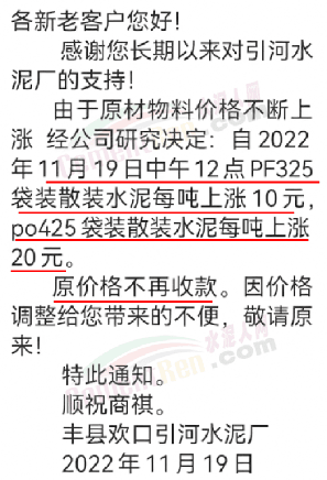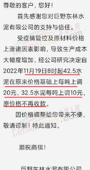 山東省菏澤市巨野東林水泥有限公司通知,受疫情管控及原材料價(jià)格上漲諸因素影響,導(dǎo)致生產(chǎn)成本大幅度增加,經(jīng)公司研究決定自2022年11月19日8時(shí)起42.5水泥在原來價(jià)格基礎(chǔ)上每噸上調(diào)20元,32.5水泥每噸上調(diào)10元,原價(jià)格不再收款。