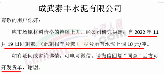 成武泰豐水泥有限公司通知,應(yīng)市場原材料價(jià)格的持續(xù)上升,經(jīng)公司研究決定自2022年11 月19日即刻起所有水泥上調(diào)10元/噸。微信回復(fù)“同意”后方可開發(fā)貨單。